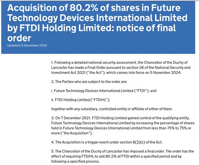 然而不到三年,这一交易却遭遇挫折。2024年11月5日,英国政府突然依据《2021年国家安全与投资法》(NISA)中的“回溯审查”条款,对这项收购发起追溯审查,并发布最终命令通知,要求FTDI Holding Ltd在限定时间内出售其持有的FTDI全部80.2%的股权,理由是存在国家安全风险。